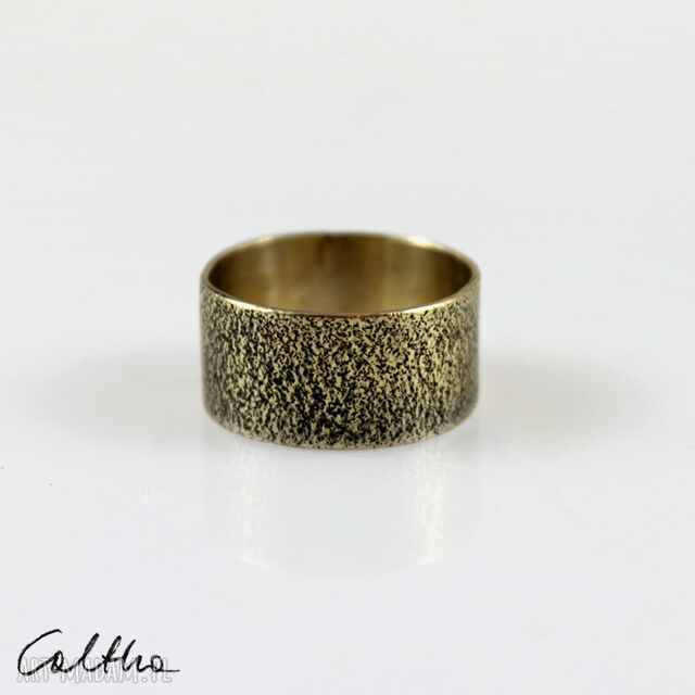 Obrączka została wykonana z alpaki (nowe srebro). Faktura została lekko podkreślona ciemną patyną uzyskaną w procesie oksydacji (bez użycia barwników).