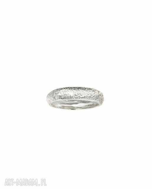 Wyjątkowa, oryginalna obrączka o pękatej formie i fakturowanej powierzchni, wykonana ręcznie ze srebra 925. Dostępna w sklepie również w wersji złoconej.